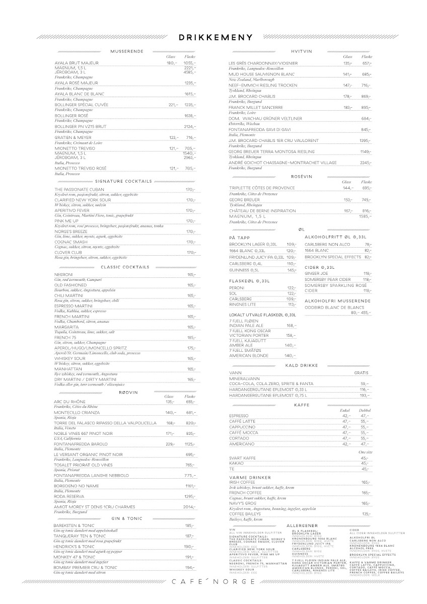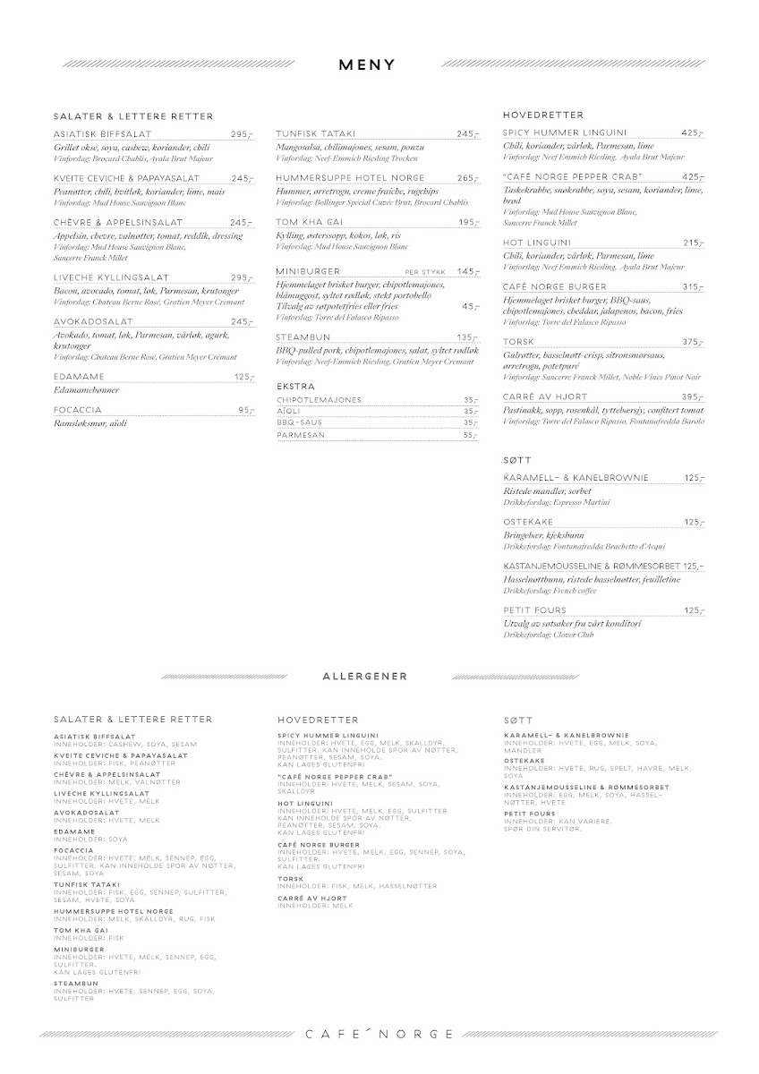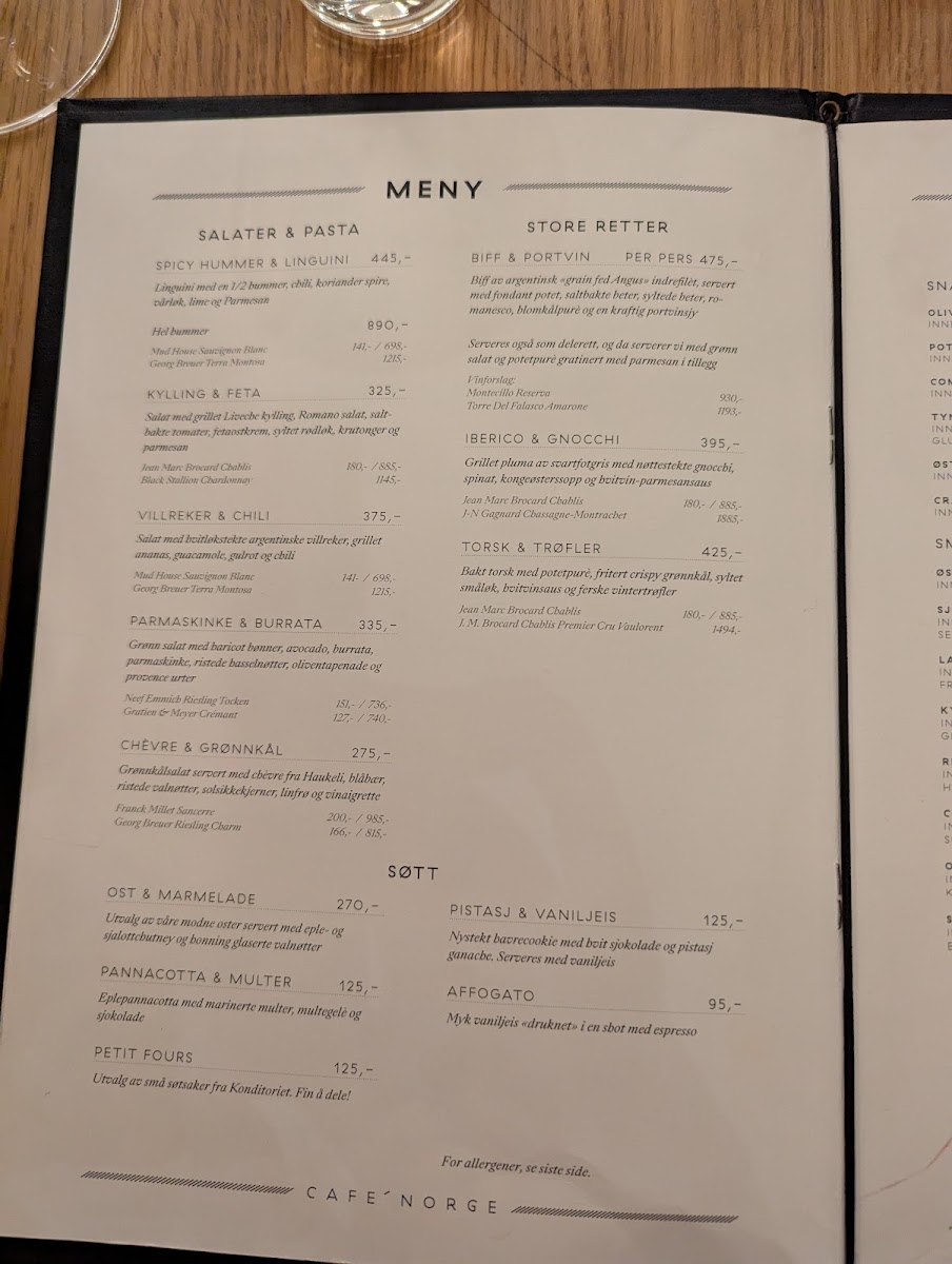 In conclusion, Cafe Norge’s menu reflects a refined balance between Nordic tradition and contemporary European flair, with a clear emphasis on high-quality ingredients and elegant presentation. The Lobster Linguini stands out as a highlight, offering a rich yet balanced seafood experience that feels both indulgent and carefully crafted, while the Iberico Pork delivers a deeply satisfying main course with its tender texture and well-developed flavors. Overall, the menu demonstrates thoughtful composition, where each dish feels purposeful rather than overly complex, and the pricing aligns with the restaurant’s upscale yet approachable dining experience. From seafood specialties to expertly prepared meats, the selection leaves a lasting impression of quality, consistency, and a kitchen that understands how to elevate classic flavors without losing their original character.